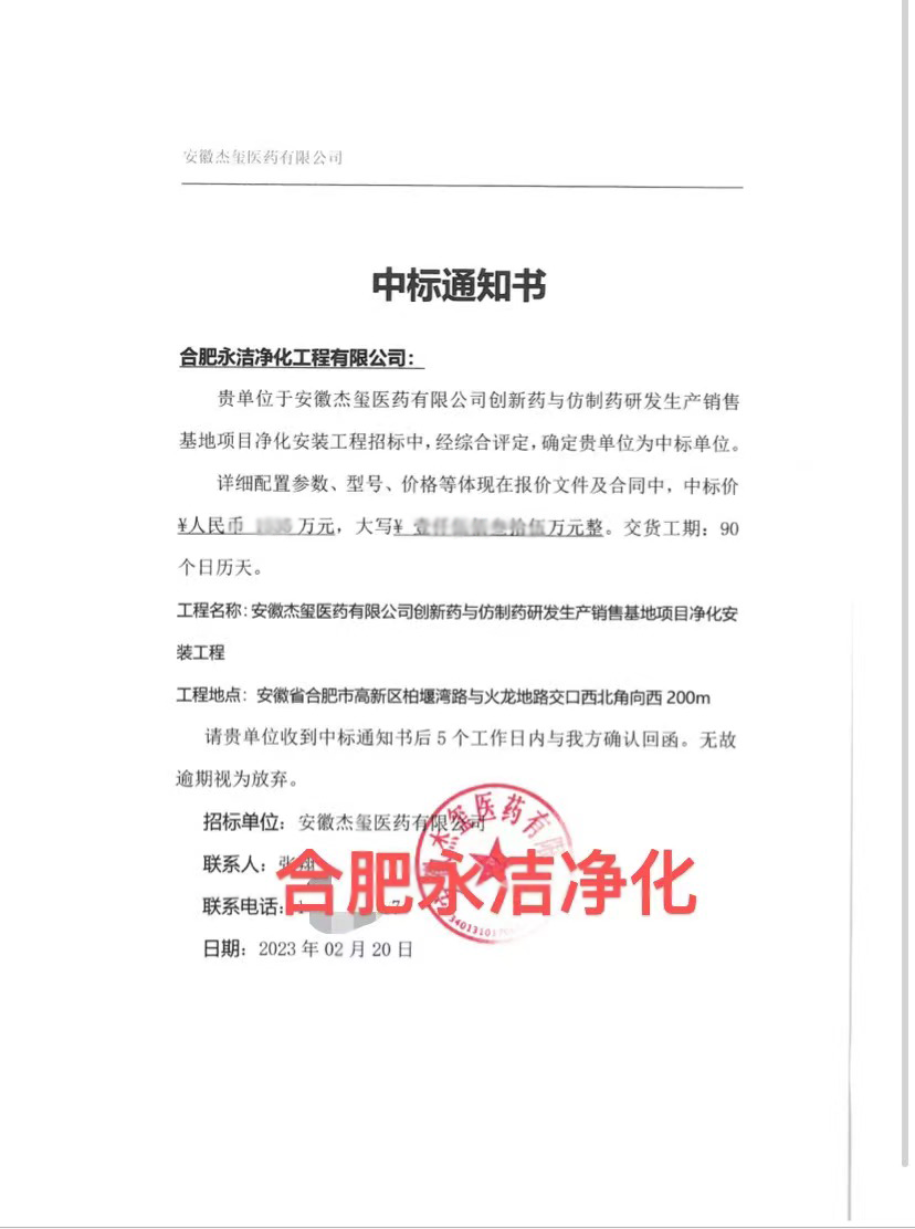 熱烈祝賀我公司中標安徽杰璽醫(yī)藥有限公司創(chuàng)新藥與仿制藥研發(fā)生產銷售基地項目凈化安裝工程!!